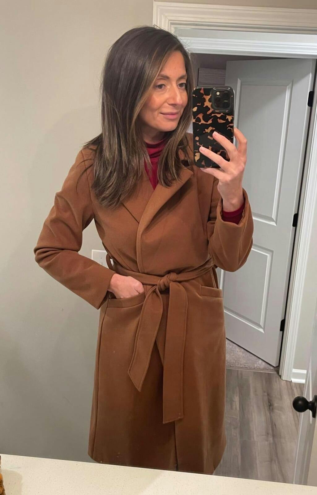 From the product images I thought “brown” would be too dark, so I ordered “light brown” which turned out to be very yellow under-toned and a bit too light/unsaturated appearing for me. Ordered brown and it was exactly what I was hoping for - a medium neutral, camel-leaning brown. Comparison shot shows brown on the left and light brown on the right. The belt is a good thickness to stay tied and lay nicely. Warm enough for winter in the south and love that it’s lined all the way through. This is a win - will be ordering in black.